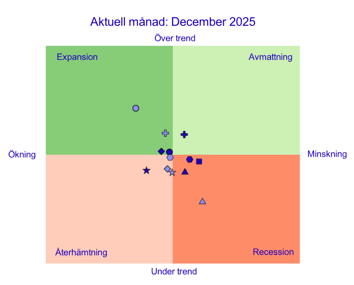 Av konjunkturklockans indikatorer låg 8 av 13 under långsiktig trend i december. Det indikerar att den svenska ekonomin ännu inte lämnat lågkonjunkturen bakom sig. Konjunkturen har dock förbättrats under andra halvan av 2025 och merparten av indikatorerna ligger i någon av tillväxtfaserna. Konjunkturklockan visade tydlig lågkonjunktur under hela 2024 och första halvåret av 2025. Många indikatorer låg i december 2025 nära den långsiktiga trenden.