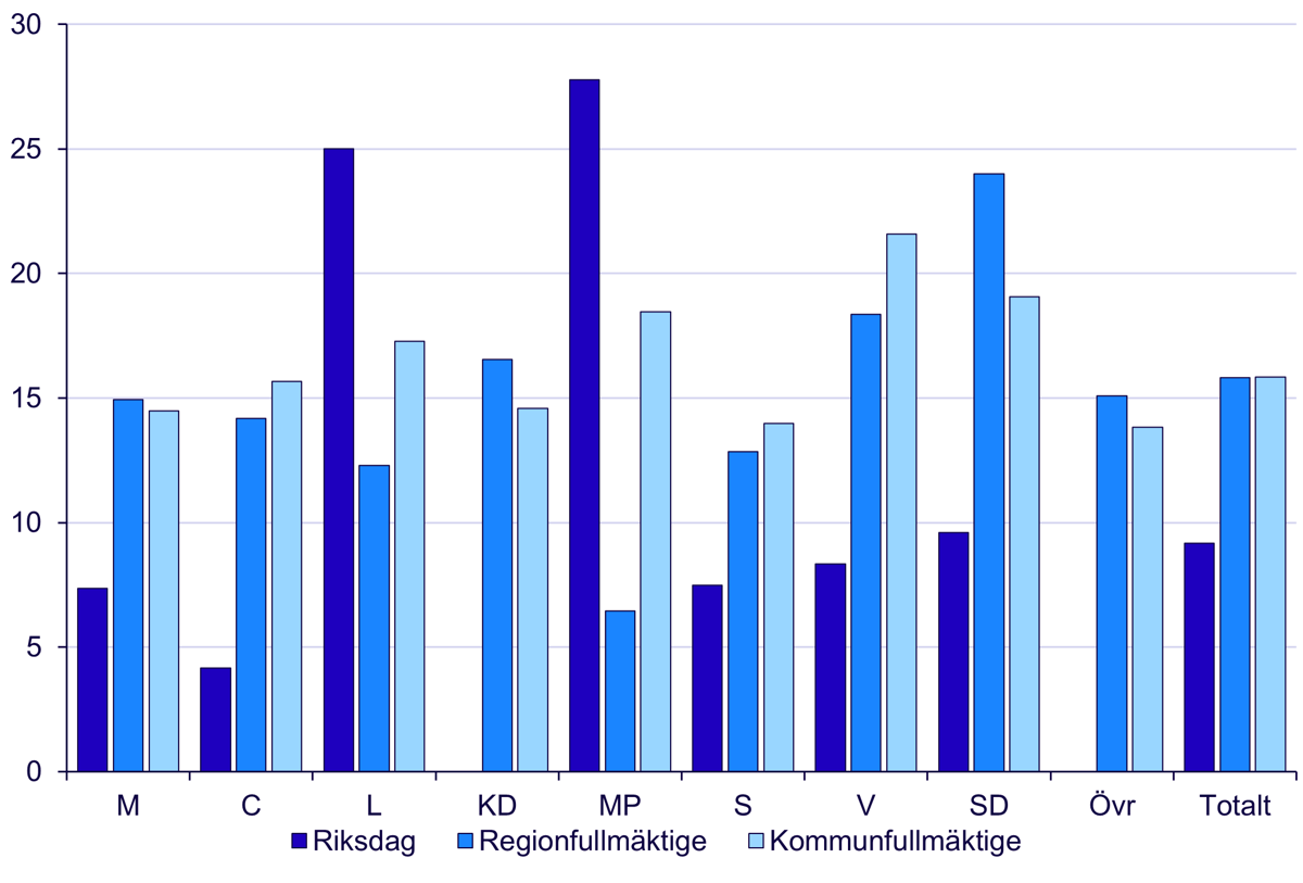 När det gäller regionfullmäktige har Sverigedemokraterna (SD) flest avhopp, nära en fjärdedel av ledamöterna har hoppat av. Vänsterpartiet (V) har flest avhopp från kommunfullmäktige, över en femtedel av hoppat av.