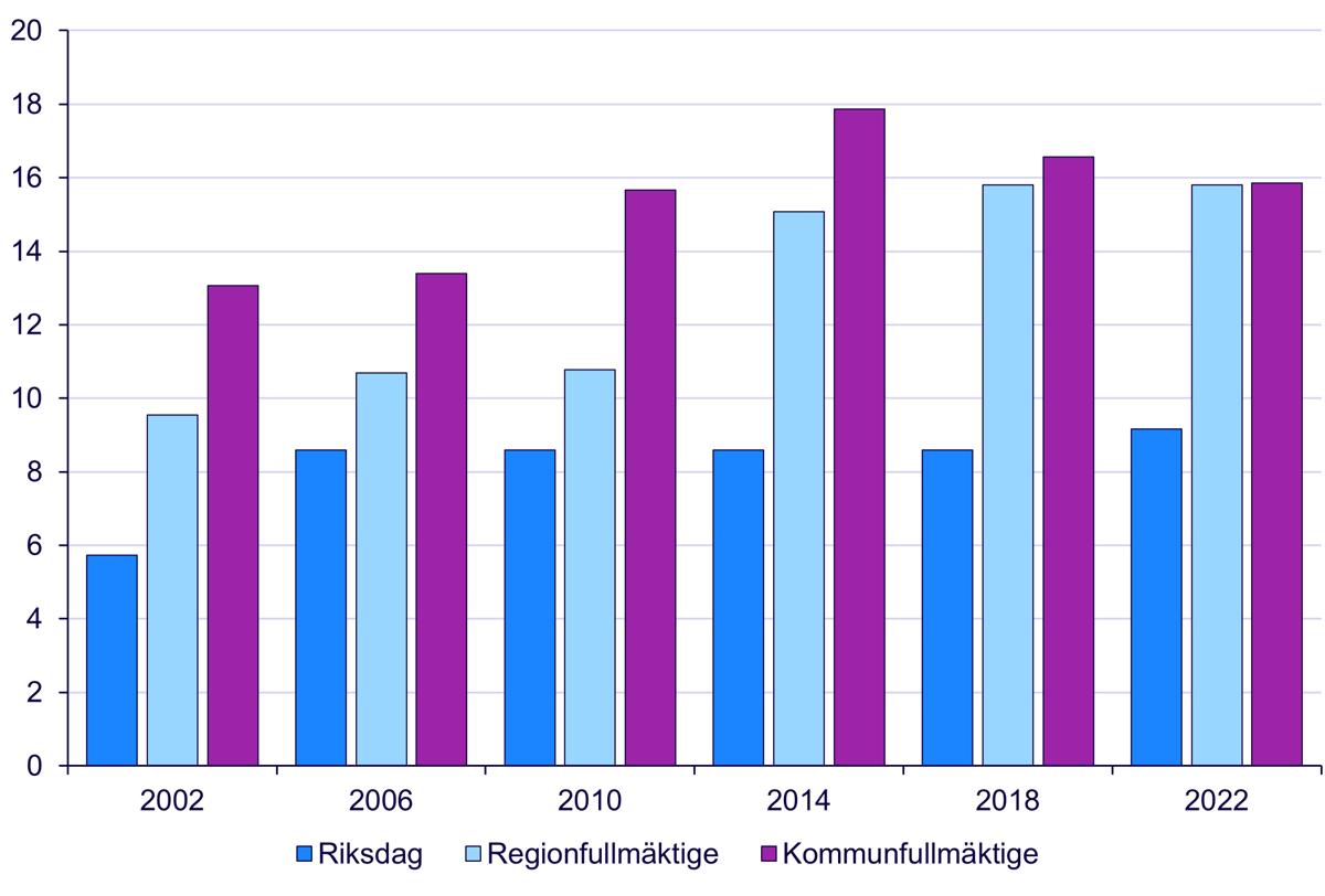 Avhopp tre år in i mandatperioden bland folkvalda i riksdag, region- och kommunfullmäktige, 2002–2022, procent