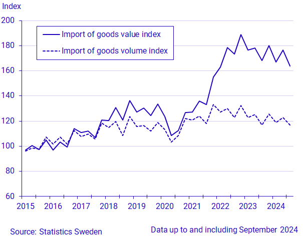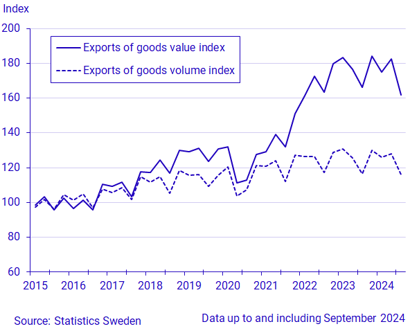 - In the period January–September 2024, exports of goods decreased by 1 percent and imports of goods decreased by 2 percent in volume.