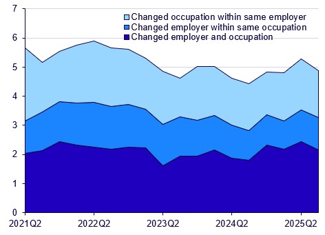 Job change is defined in the report as the number or proportion of respondents who change employers for their main job, or who change occupational code according to SSYK 2012 at a detailed level from one quarter to another, among the permanent employees who remain employed.