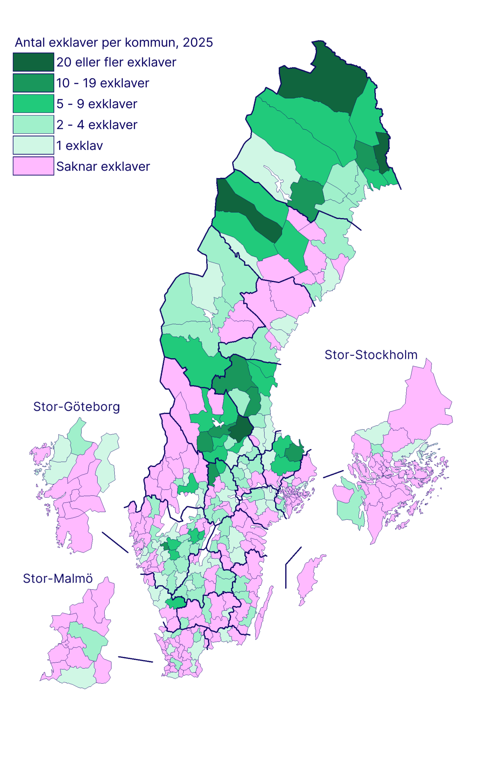 Exklaver är relativt vanligt förekommande på kommunal nivå i Sverige fast de sällan syns på kartor över kommunerna för att undvika att göra gränserna för komplexa och svårtolkade. Kommunala exklaver utmanar vår intuitiva bild av kommunen som en sammanhängande territoriell enhet.
