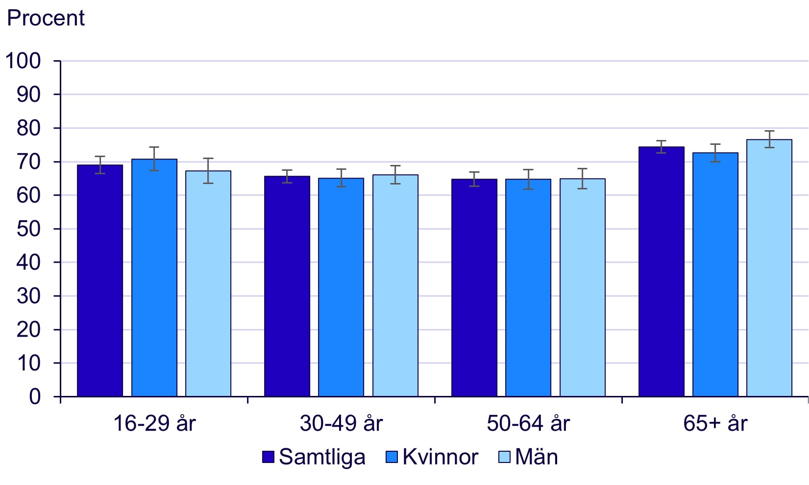 Det är ingen signifikant skillnad i andel glada kvinnor och män inom respektive åldersgrupp. Däremot är det en större andel personer 65 år och äldre som för det mesta eller alltid känner sig glada än personer i de yngre åldersgrupperna.