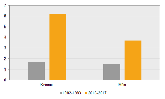Ökningen har varit större bland kvinnor än män. Åren 1982–83 hade 2 procent av förvärvsarbetande kvinnor och män varit utsatta för hot eller våld i arbetet. Åren 2016–17 hade andelen ökat till 4 procent bland män och 6 procent bland kvinnor.
