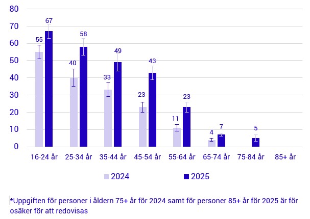 Andel personer 16 + år som har använt generativa AI-verktyg under de senaste tre månaderna, efter ålder, 2024 och 2025, procent.
