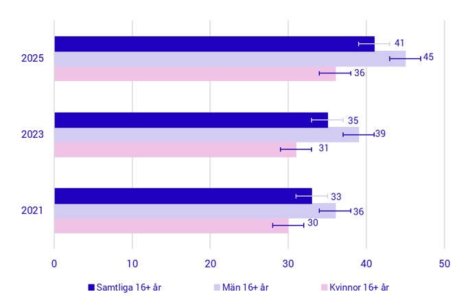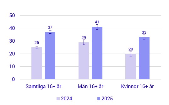 Resultatet från årets undersökning visar att användningen av generativa AI-verktyg har ökat markant i Sverige mellan 2024 och 2025. Bland befolkningen i åldern 16 år eller äldre har andelen som uppger att de använt sådana verktyg stigit från 25 till 37 procent. Män är fortsatt mer benägna att använda generativa AI-verktyg än kvinnor. Bland män ökade användningen från 29 till 41 procent mellan 2024 och 2025, medan andelen kvinnor ökade från 20 till 33 procent. Båda grupperna visar en ökning, men användningsnivån skiljer sig fortfarande mellan kvinnor och män.