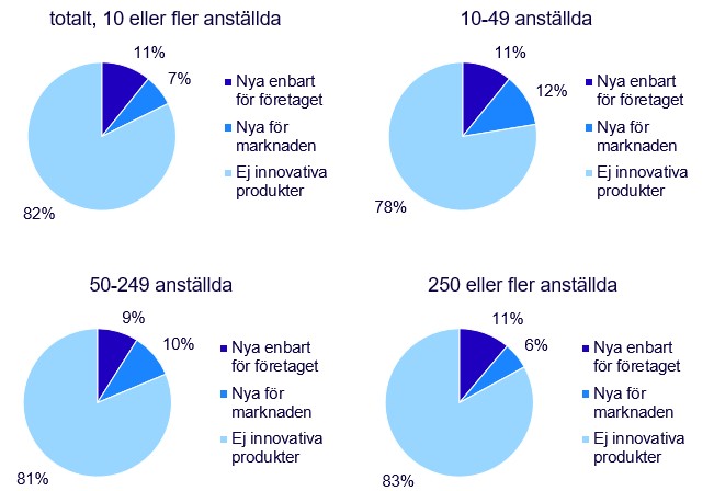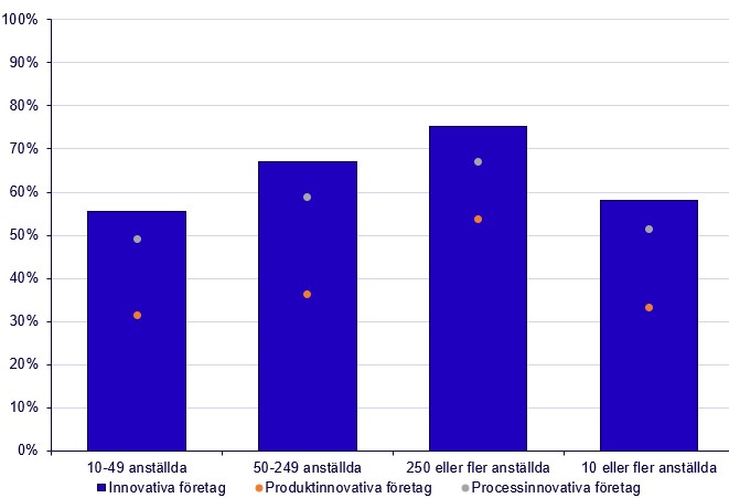 Andelen innovativa företag var lägst bland de små företagen (10–49 anställda), vilket är den största gruppen sett till antal företag, jämfört med de medelstora (50–249 anställda) och stora företagen (250 eller fler anställda). 55 procent av de små företagen var innovativa jämfört med 67 och 75 procent av de medelstora respektive stora företagen under 2022–2024. Likt tidigare referensperioder fortsätter processinnovationer att vara den vanligaste typen av innovation. 51 procent av svenska företag introducerade någon processinnovation medan 33 procent introducerade någon produktinnovation.