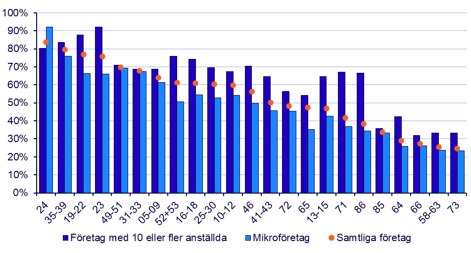 Bland de tio branschgrupper med högst andel företag som introducerat minst en innovation med någon miljöfördel tillhörde åtta industrisektorn, varav sex tillhörde tillverkningsindustrin, och två tillhörde tjänstesektorn. Bland de tio branschgrupper med lägst andel företag som introducerat minst en innovation med någon miljöfördel tillhörde nio tjänstesektorn och en tillhörde tillverkningsindustrin. Industrisektorn har generellt större miljöpåverkan än tjänstesektorn. Att det var en högre andel miljöinnovativa företag i industrisektorn skulle kunna förklaras av att dessa företag, i genomsnitt, hade en större miljöpåverkan och kan ha haft större utrymme för innovationer som minskar deras miljöpåverkan.