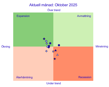 Konjunkturklockan fortsätter visa vägen mot starkare konjunktur. I oktober 2025 låg fem indikatorer i expansionsfasen. De mer framträdande förflyttningarna som skedde i klockan i oktober var hushållens konsumtion och industrins orderingång. Sedan våren 2023 fram till sommaren i år har BNP-indikatorn visat på ett konjunkturläge under långsiktig trend, vilket betyder lågkonjunktur. Oktober 2025 var dock tredje månaden i rad som BNP-indikatorn befann sig över långsiktig trend.