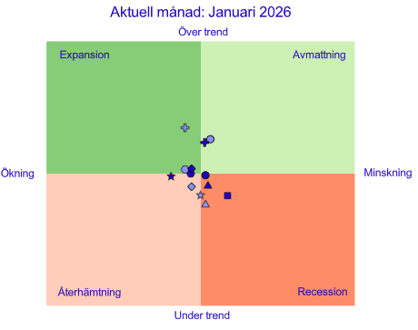 SCB:s konjunkturklocka indikerar att den svenska ekonomin är starkare än för ett år sedan. I januari 2025 låg samtliga indikatorer utom en under långsiktig trend vilket innebar att det rådde lågkonjunktur. Läget förbättrades successivt under året men konjunkturuppgången tappade fart mot slutet av 2025 och början av detta år. I januari 2026 låg 6 av 13 indikatorer över sin långsiktiga trend men bilden var spretig med indikatorer i samtliga fyra konjunkturfaser. Många indikatorer ligger dock nära trend vilket visar att ekonomin är nära ett normalläge.