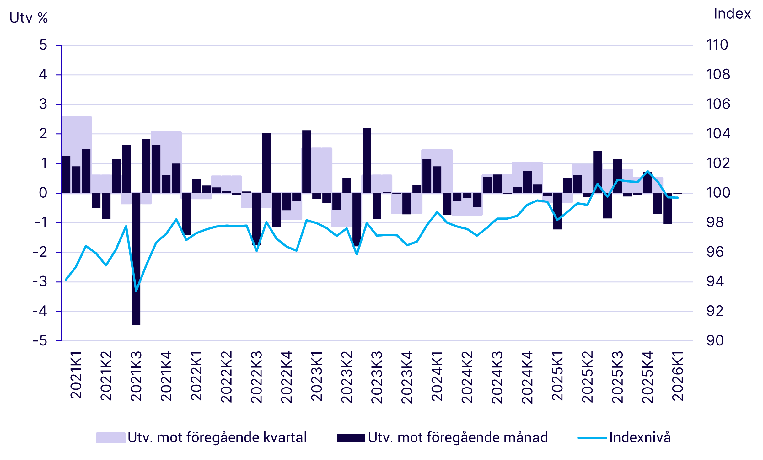 BNP, säsongrensad volymutveckling och index (2025=100)