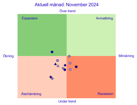 Diagrammet visar att fördelningen är ganska jämn mellan indikatorer som ligger över och under sin långsiktiga trend. Samtliga indikatorer ligger i de två vänstra kvadranterna vilket betyder att ekonomin är på uppgång. Den månatliga BNP-indikatorn har precis lämnat återhämtningsfasen och gått över till expansionsfasen.