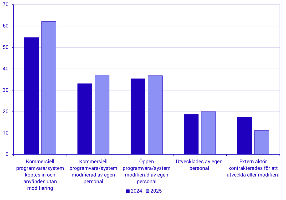 Det vanligaste sättet att förvärva AI är att köpa in mjukvara som är redo att användas, det gör 62 procent av företagen. Ungefär 37 procent av företagen satsar på kommersiell mjukvara eller system som modifierats av egen personal.