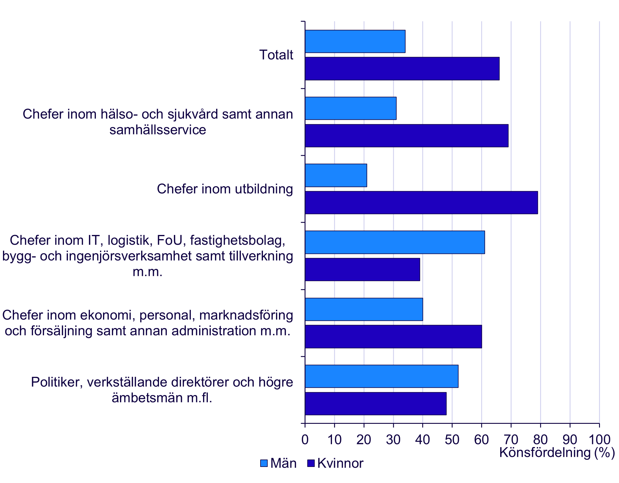 I offentlig sektor gäller det omvända. Inom utbildning är 80 procent av cheferna kvinnor, och inom hälso- och sjukvård ca 70 procent.