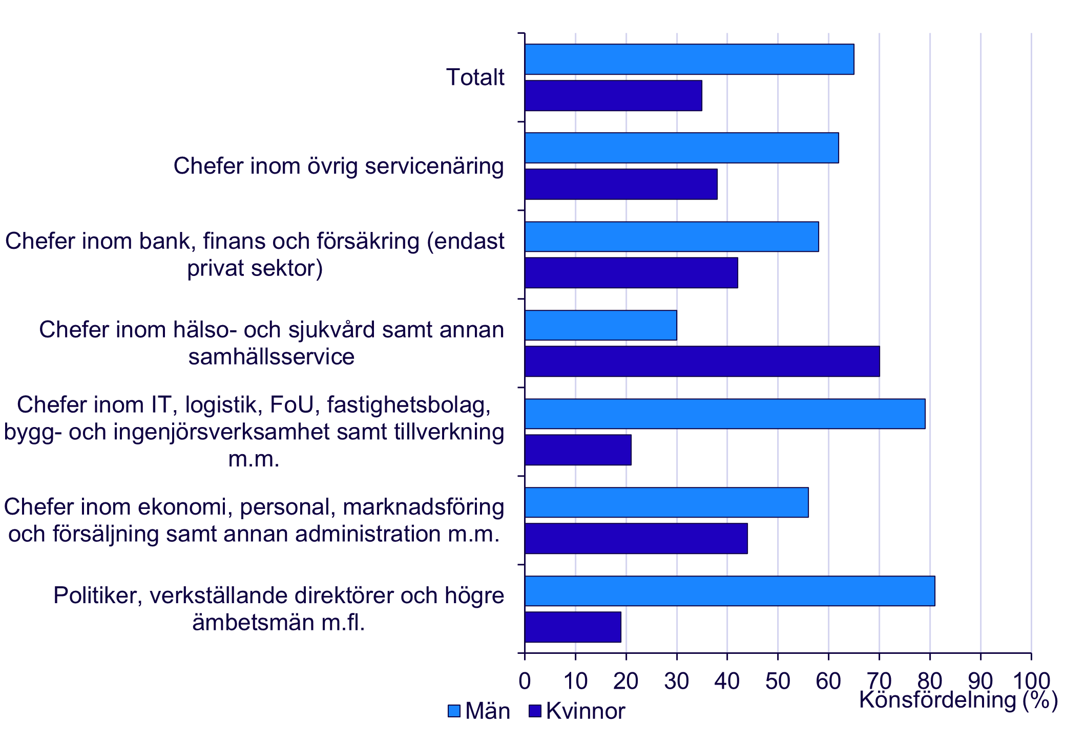I privat sektor är det vanligare med manliga chefer. Verkställande direktörer och chefer inom bland annat IT, logistik och bygg är till 80 procent män, och i hela den privata sektorn är 65 procent av cheferna män. Undantaget är privat hälso- och sjukvård där 70 procent av cheferna är kvinnor.