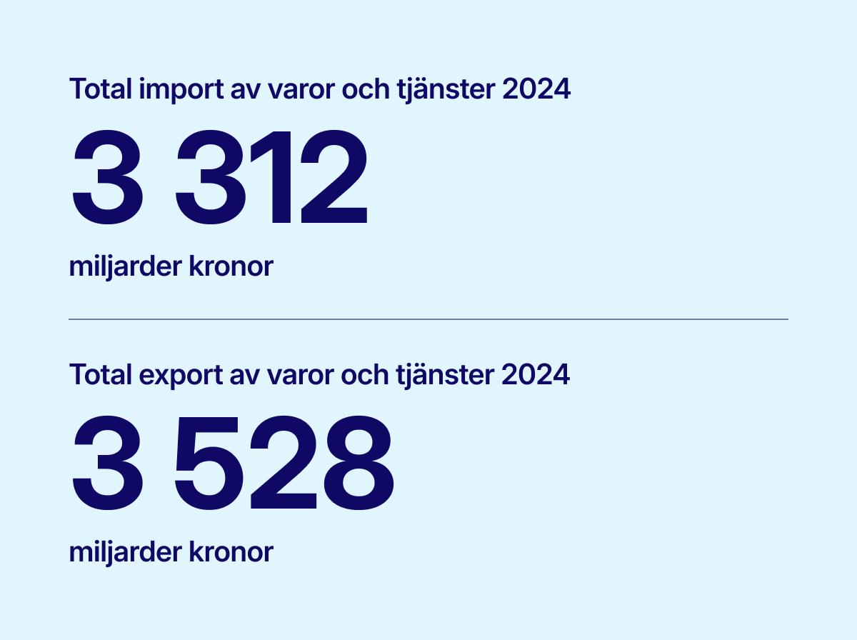 Sverige köper varor från andra länder. Bilar, olja, elektronik är exempel på varor vi importerar. Sverige säljer också varor till andra länder. Bilar, läkemedel och papper är exempel på varor vi exporterar. Den mesta handeln är med länder i Europa. Sverige importerade mycket från Tyskland. Vi importerade även från Norge, Nederländerna, Danmark och Kina. Norge och Tyskland var de länder Sverige exporterade mest varor till.