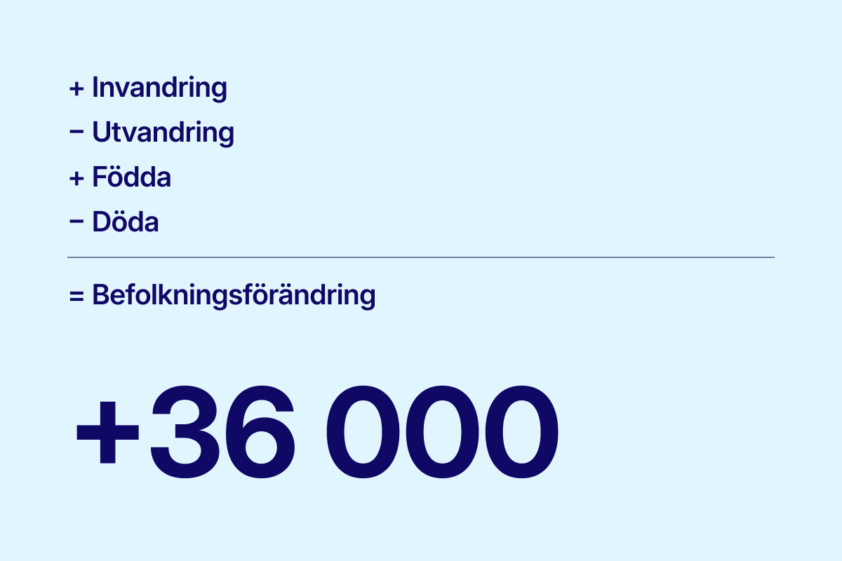 Sveriges befolkning ökade 2024 med 36 000 personer eller 0,3 procent. Att vi blir fler beror på att det föds fler människor än det dör. Det beror också på att flera personer invandrar till Sverige än som utvandrar.